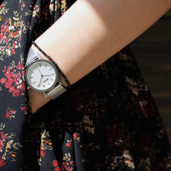 極簡輕薄系列–倒影款獨創0.8mm厚度斜面12時位設計的錶款,透過細緻工藝製作成的指針及不銹鋼錶身搭配,傳遞出濃濃復古時尚感。錶款錶面採用抗磨損藍寶石水晶玻璃而機芯則選用瑞士製,是款男女皆可配戴的情侶錶,另可搭配尼龍錶帶。