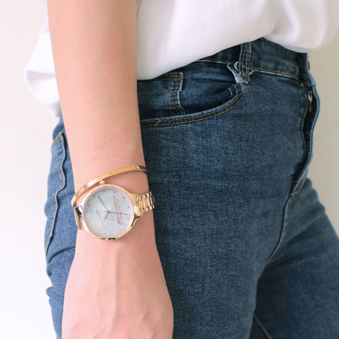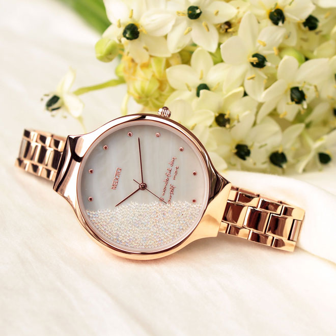 特殊的雙層錶殼設計,使夢幻的透明珠子能流動於典雅的天然貝殼錶面中,就如同女孩們浪漫的夢想隨著時間一點一滴成真。而於天然貝殼錶面上,我們也送給妳特殊的驚喜,希望當妳遇到挫折能時時刻刻告訴自己