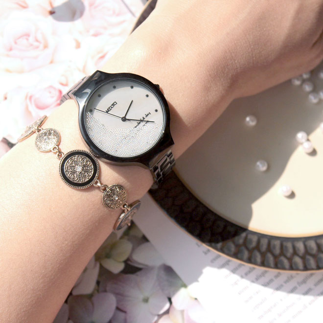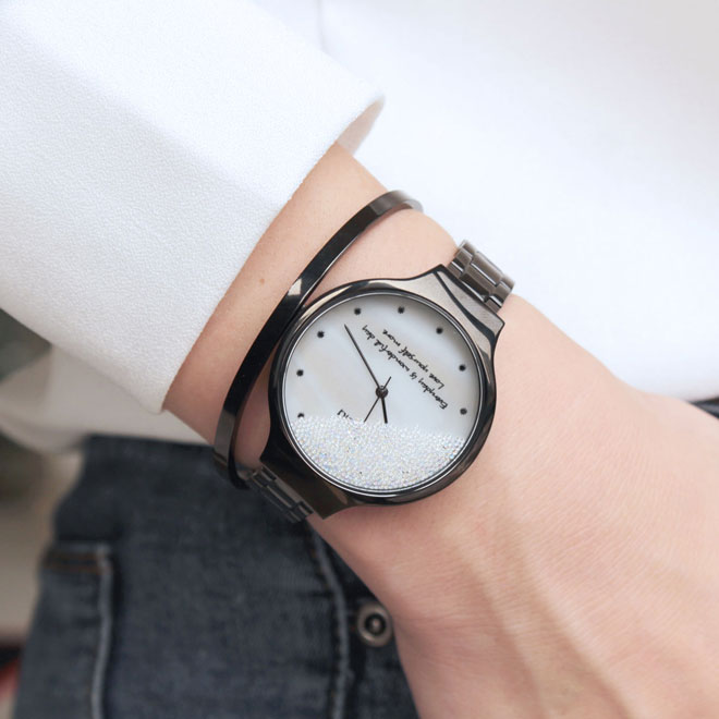 特殊的雙層錶殼設計,使夢幻的透明珠子能流動於典雅的天然貝殼錶面中,就如同女孩們浪漫的夢想隨著時間一點一滴成真。而於天然貝殼錶面上,我們也送給妳特殊的驚喜,希望當妳遇到挫折能時時刻刻告訴自己