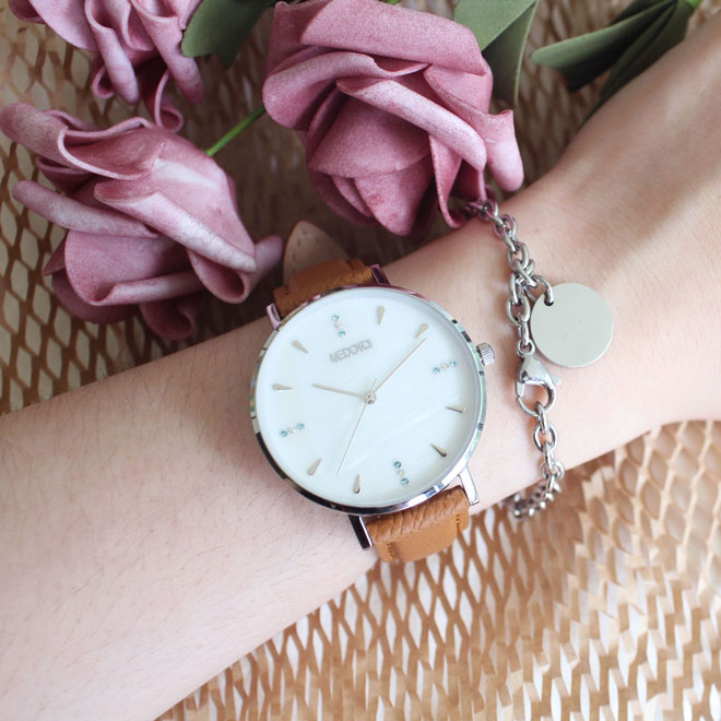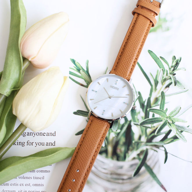 將柔和的貝殼錶面搭配上耀眼動人的鑽石,在與法國進口真皮錶帶做結合,使整體錶款增添幾分個性感詮釋出一位耀眼動人女性擁有勇敢外表和溫柔的內心的特質