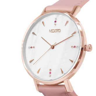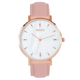 將柔和的貝殼錶面搭配上耀眼動人的鑽石,在與法國進口真皮錶帶做結合,使整體錶款增添幾分個性感詮釋出一位耀眼動人女性擁有勇敢外表和溫柔的內心的特質
