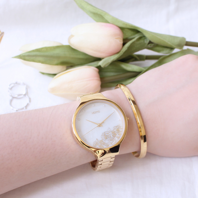 精緻的玫瑰雕花、純白的珍珠時位、浪漫的貝殼錶面